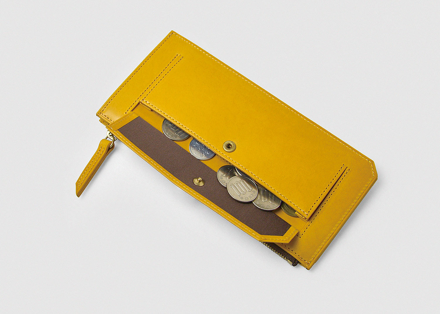 カードを数枚入れてもかさばる事がないため、スマートに持ち歩けるだけではなく、レシートやコインも収納しやすい作りをしています。背面には、スナップボタン使用の独立したコインスペースがあり、コインを分けて入れることができます。ポケットは5個あり、外側のポケットの形状を斜めにカットしたデザインにしたことで、カードが見えやすいだけではなく、出し入れしやすい仕様に仕立てました。