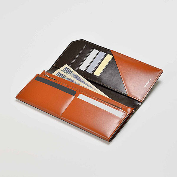 日本独自の手法である風琴マチは、通常の谷折りのマチと異なり、山折りの形状をしているため、お札をポケットの真ん中に収納しても折れることなく、取り出しやすい作りになっています。マチの革の継ぎ目に厚みが出ないため、薄く持ち運びもしやすいことが特徴です。