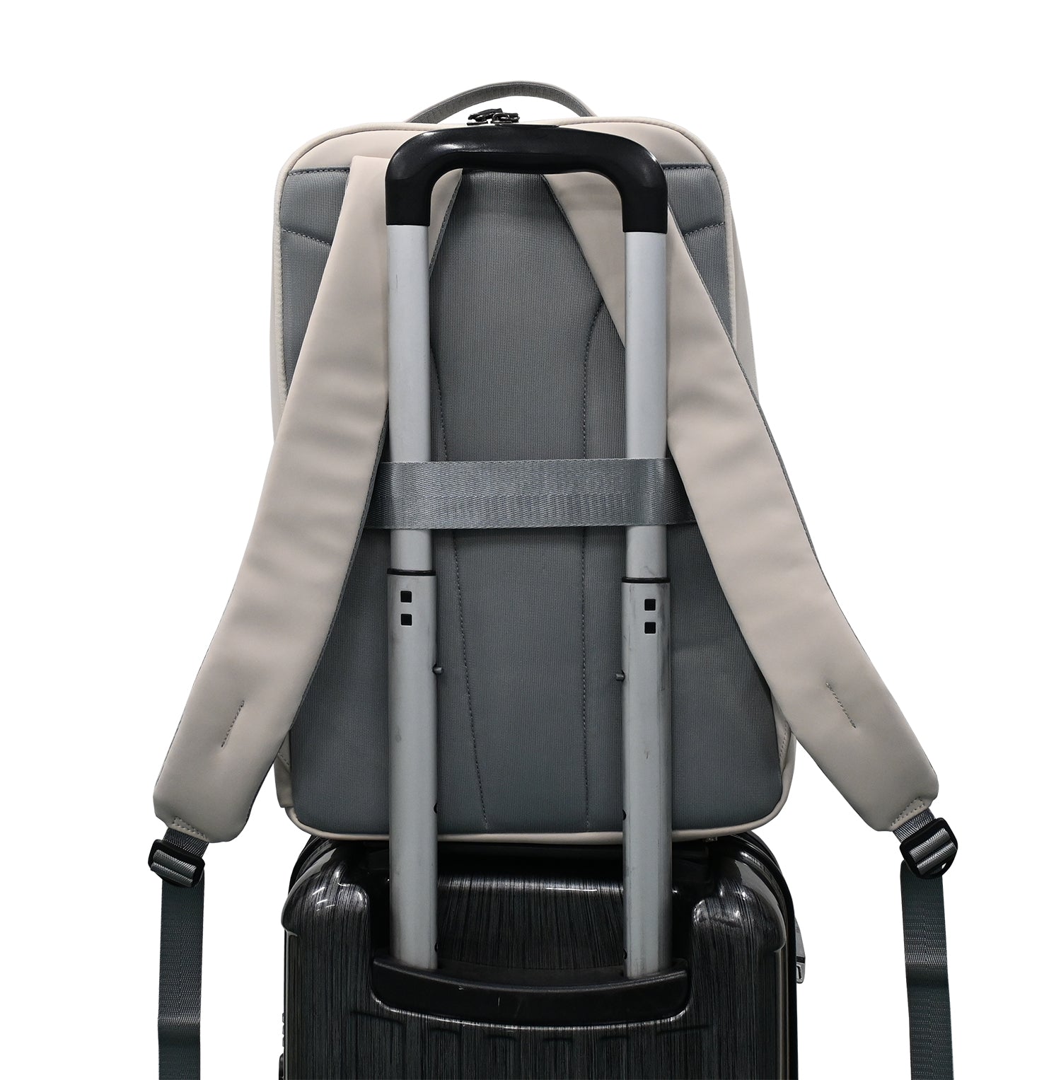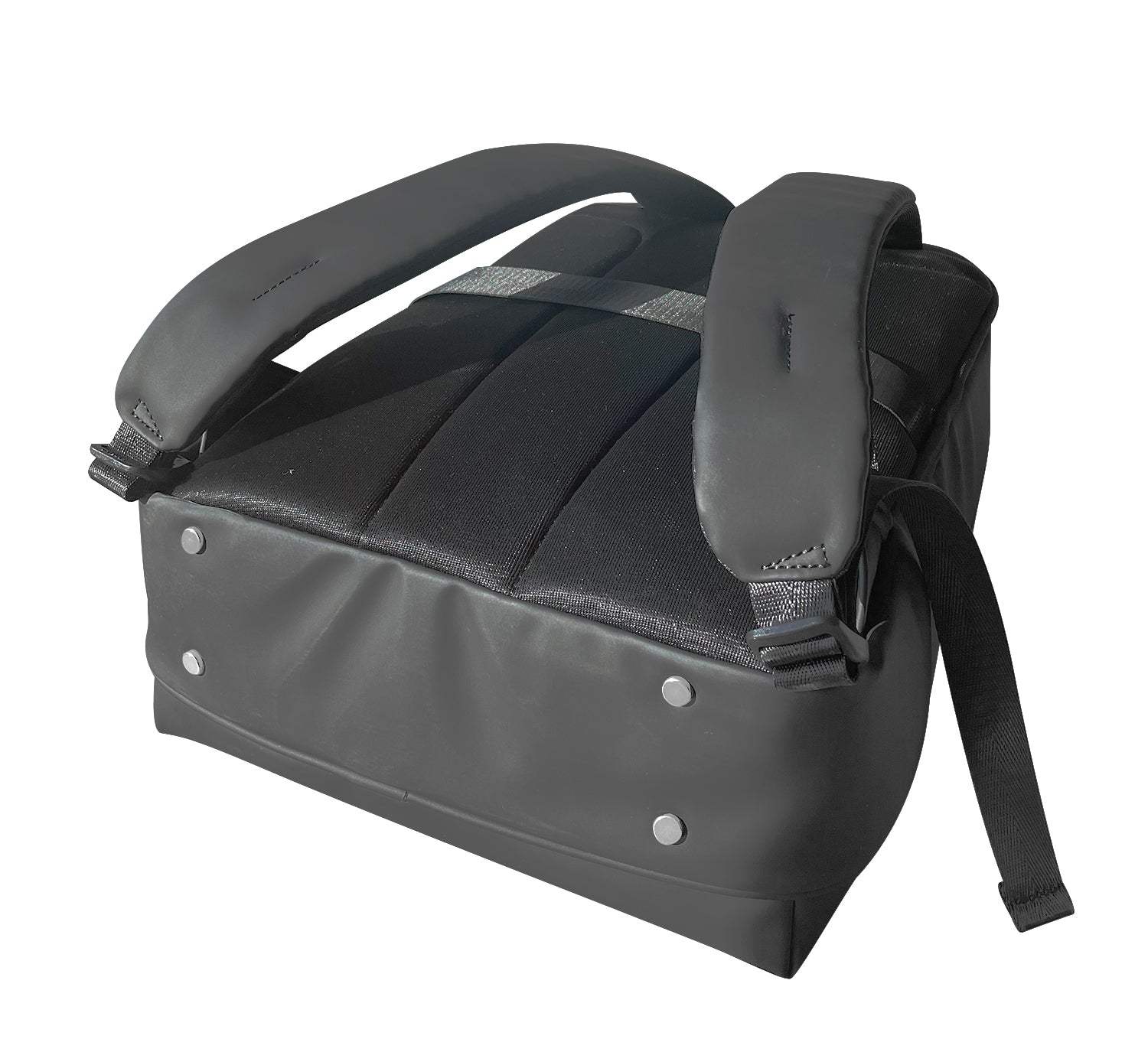 ・背面にはキャリーケースのバーに取り付けられるベルトを装備。