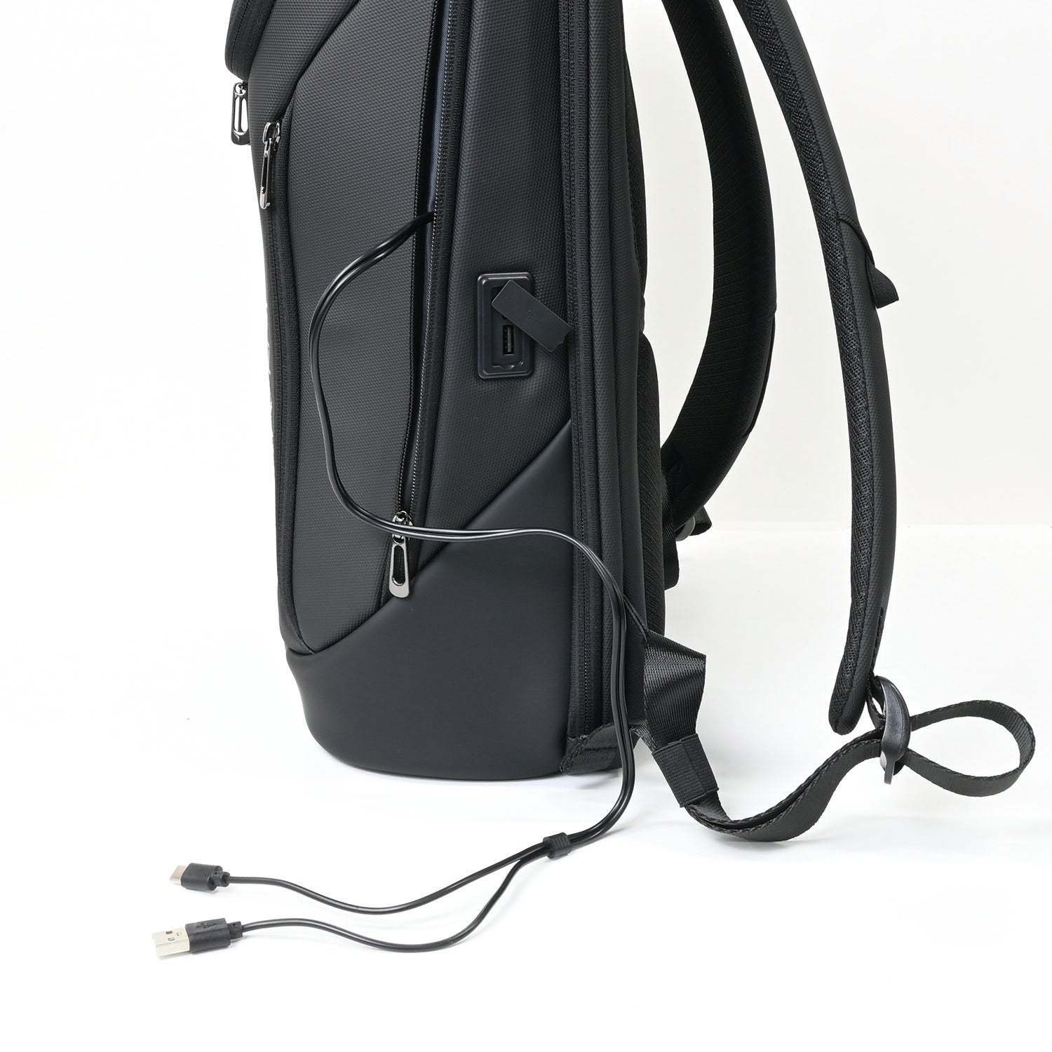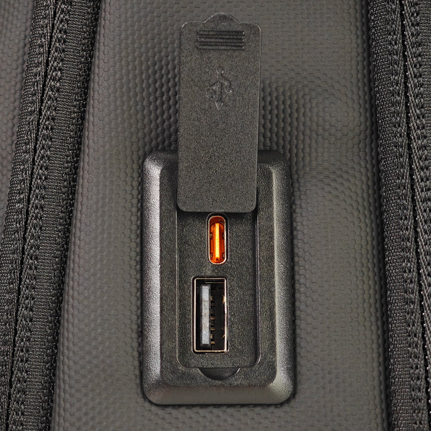 ・右サイドポケットにお手持ちのモバイルバッテリーにつなげられる外部USBポート搭載 スマホの充電に最適