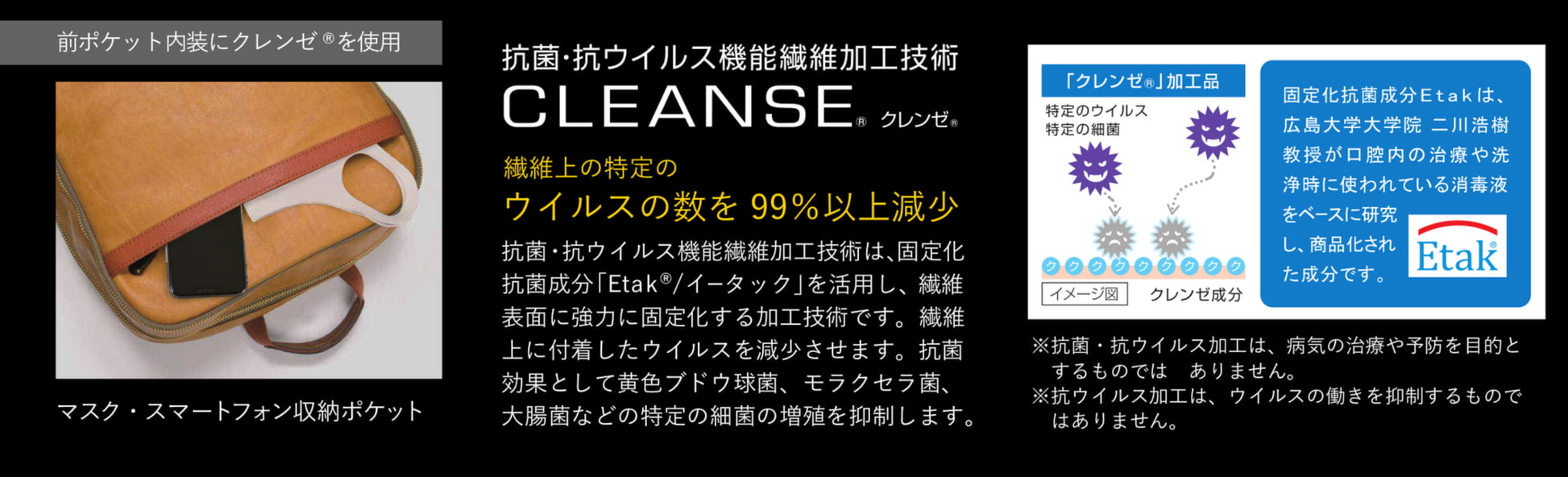 ・前ポケット内装に抗菌・抗ウイルス機能繊維「CLEANSE®」を使用。
