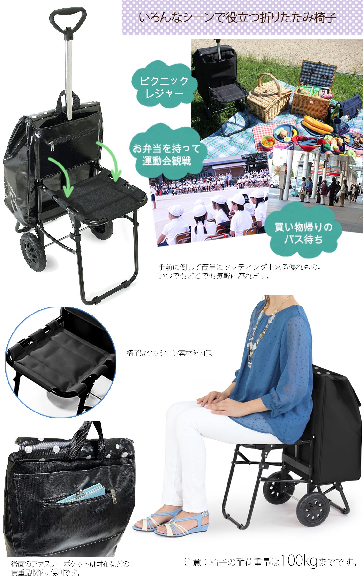 折りたたみ椅子付きカート 訳あり販売 アウトドア、海水浴に、スポーツ観戦、運動会などで大活躍 免許返納 キャリー 買い物 プレゼント 敬老の日 旅行 椅子付きショッピングカート 26L ウノフク UNOFUKU 15-5011