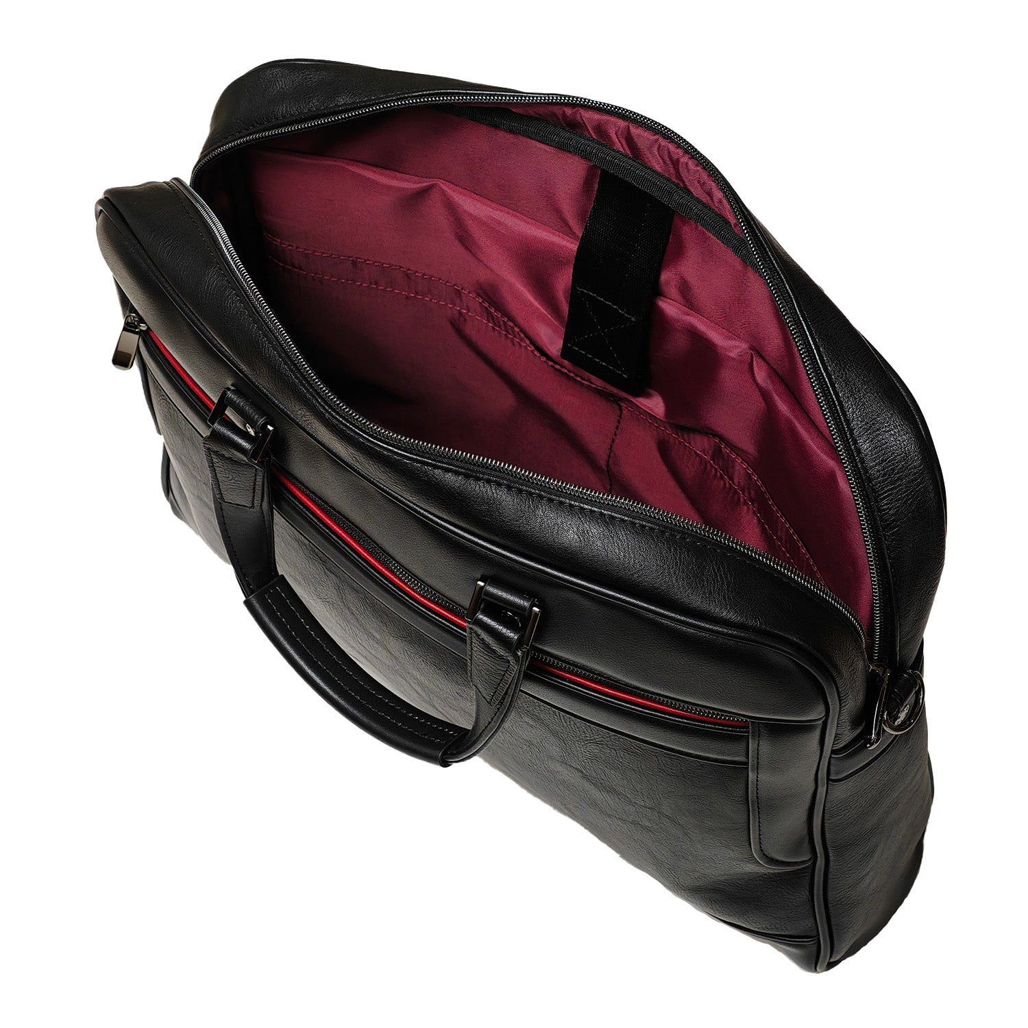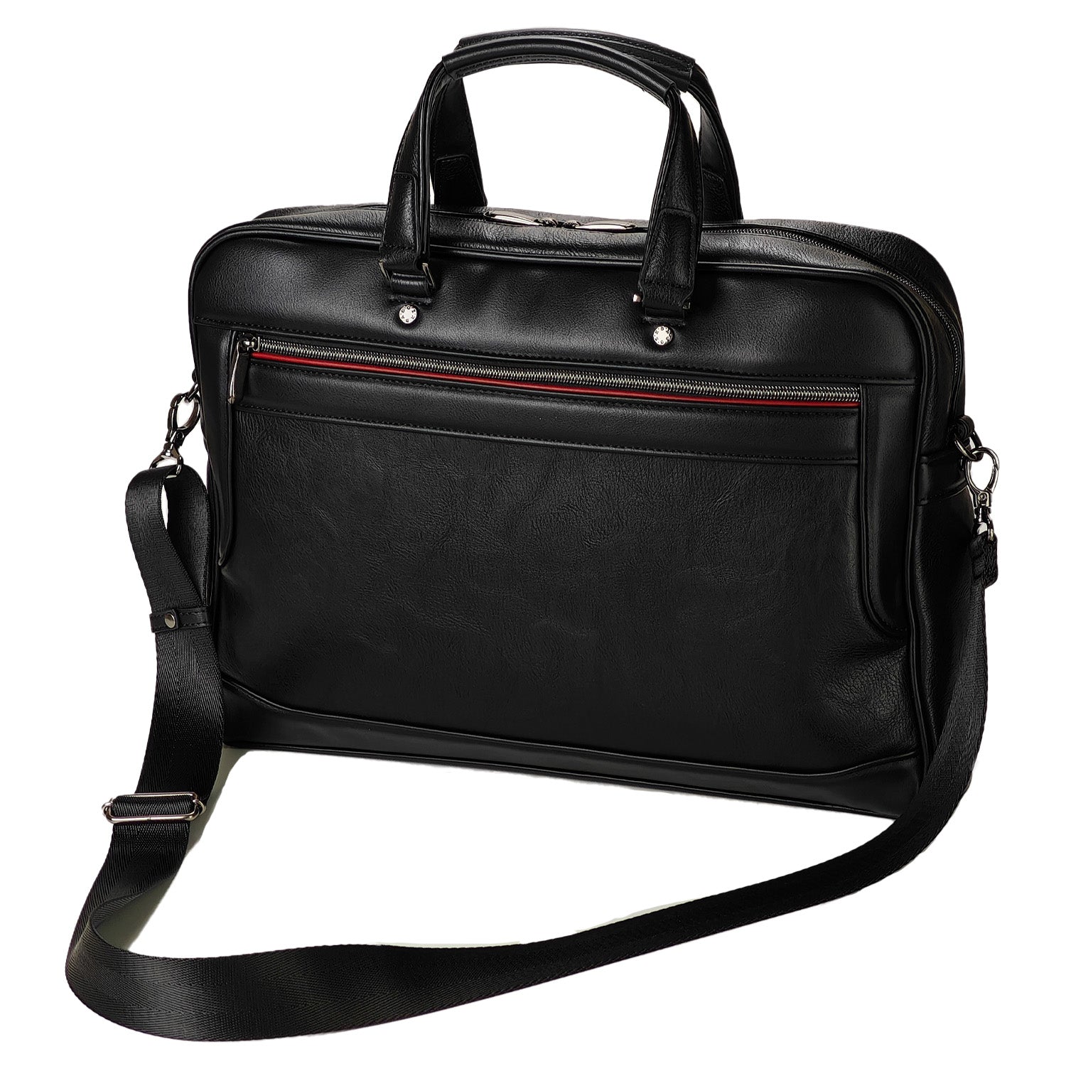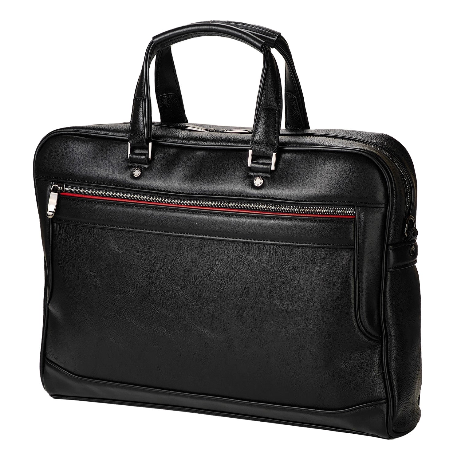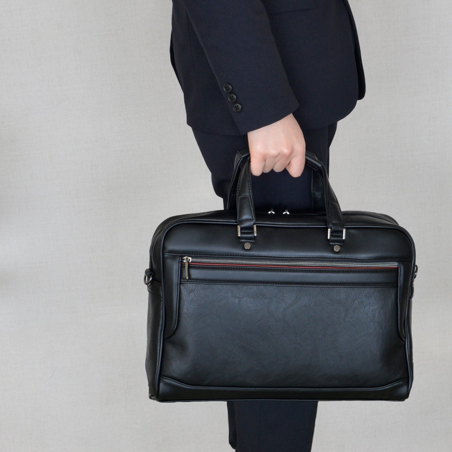 異なる素材感のコンビネーションと、フロントの赤いラインがビジネスバッグにカジュアル感をプラスし、フォーマルなスーツスタイルにも、ジャケパンスタイルにもマッチ。